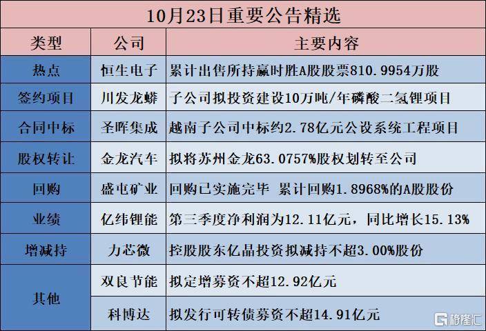 【热点】恒生电子(600570.SH):累计出售所持赢时胜A股股票810.9954万股【项目投资】川发龙蟒(002312.SZ):子公司拟投资建设10万吨/年磷酸二氢锂项目【中标合同】