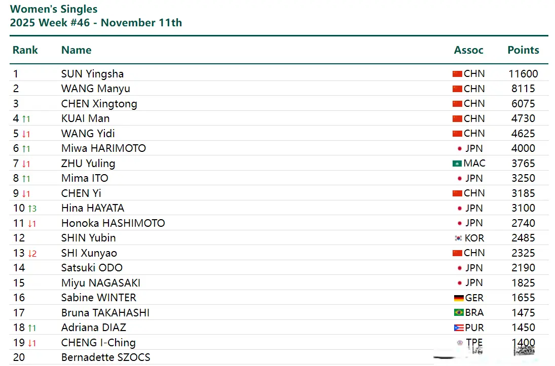 女单方面,中国澳门选手朱雨玲从第6下滑至第7、国乒小将陈熠从第8退步至第9,日本削球名将桥本帆乃香刚成为世界第10、这次又退居第11;此外国乒2位主力的位置也发生变动,蒯曼再次超越师姐王艺迪,成为世界排名第4的选手。