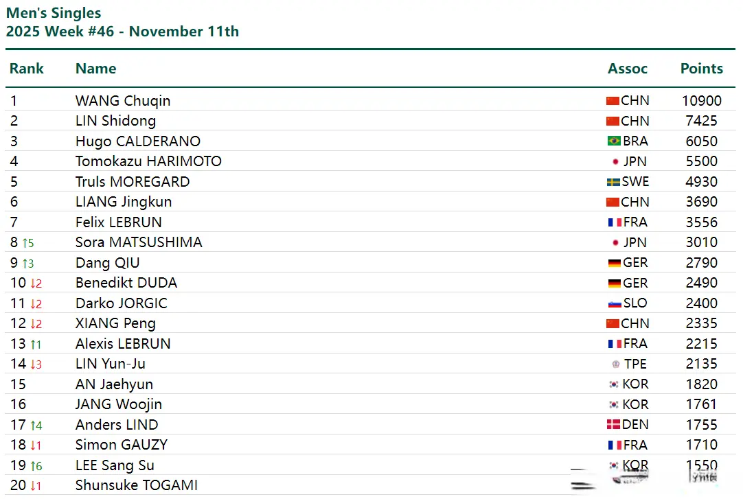 国际乒联2025年第46周世界排名已于今天(11月11日)出炉,头部选手位置发生较大变化,其中才在WTT法兰克福冠军赛上夺得男单冠军的18岁日本小将松岛辉空首次跻身世界前十、来到第8名,女单冠军早田希娜也回升至第10,二人的队友张本美和、伊藤美诚同样有进步,国乒选手蒯曼进步,王艺迪、陈熠、向鹏等人下滑,详细情况请看下文。