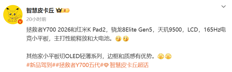 【CNMO科技消息】近日,数码博主“智慧皮卡丘”发文称,拯救者Y700 2026款与REDMI K Pad2两款小尺寸平板将分别搭载骁龙8 Elite Gen5移动平台和天玑9500处理器,均配备LCD屏幕,支持165Hz刷新率,主打性能释放与大容量电池。该博主还指出,其他品牌的小平板大多转向OLED轻薄系列,在边框设计和质感方面将有一定优势。