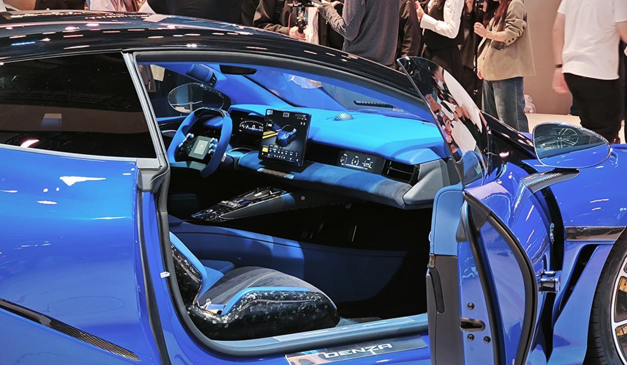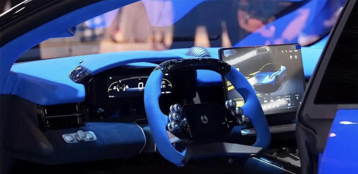 腾势Z敞篷版内饰采用了冷色调为主的配色方案,大面积蓝色Alcantara麂皮材质和碳纤维材质的交替铺陈,再加上蓝色高级复合面料和黄色的菱形缝线,多色的拼接工艺,还有亮黑色钢琴烤漆饰板、哑光色碳纤维装饰面板的交替运用,再配上前排两个桶装赛车座椅和四点式安全带,营造出了更加浓郁的赛车氛围。中控台的布局与此前曝光的腾势Z量产版车型保持一致,中控台采用了类似游戏手柄样式的方向盘,两侧加入了大尺寸换挡拨片,配合着更多高阶智驾辅助,带来了更加优秀的操控体验。科技感方面,该车配备了彩色全液晶仪表、AR-HUD抬头显示系统、巨大的悬浮式中控大屏和矩形嵌入式副驾显示屏,同时还有帝瓦雷品牌高端音响。