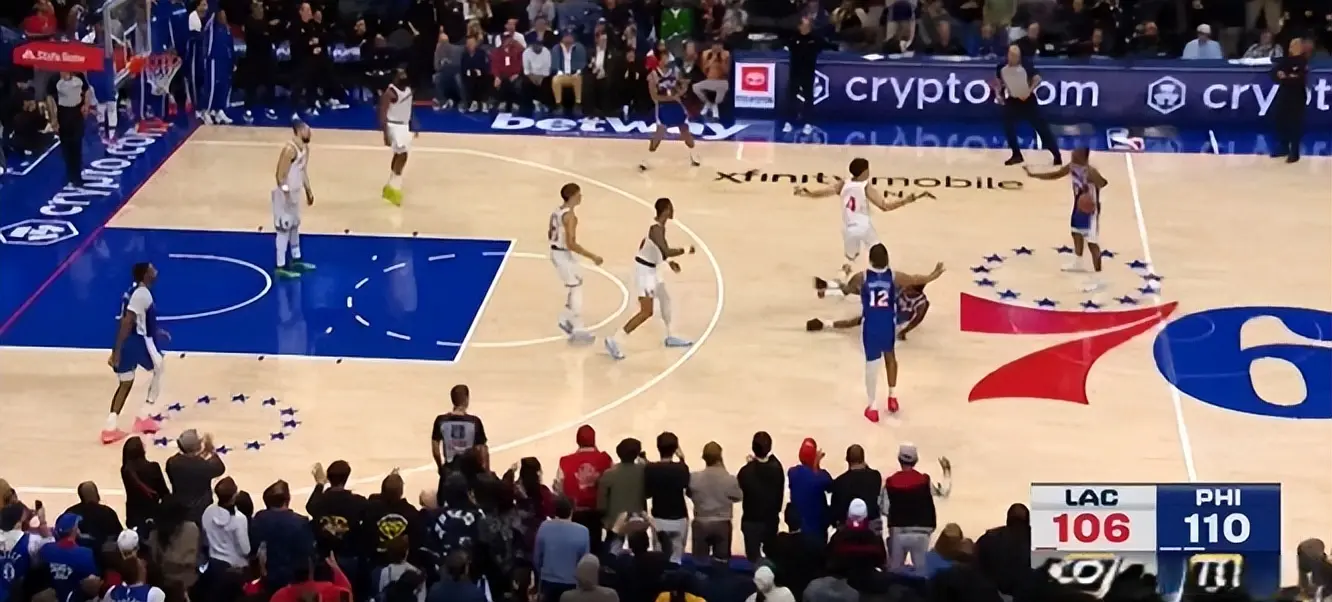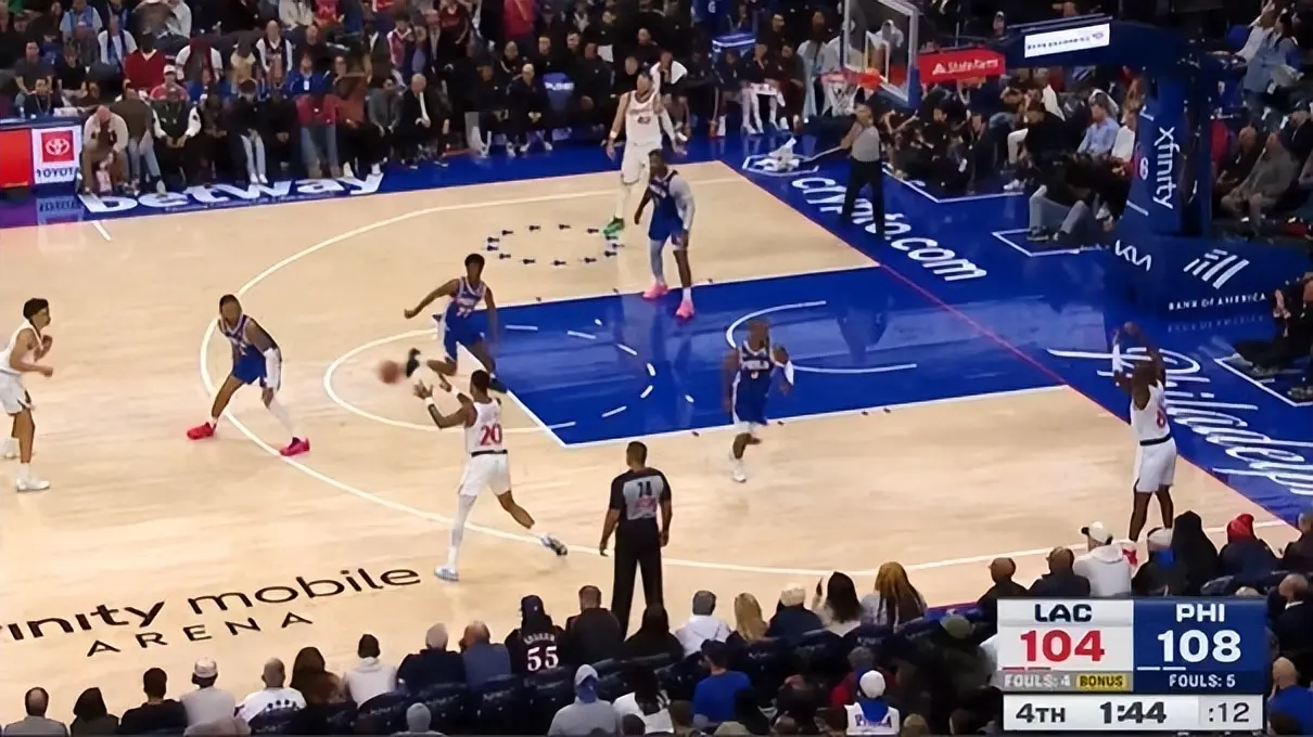 比赛还剩1分44秒时,76人中锋德拉蒙德在身边一米范围内没有明确防守者的情况下在禁区待的过久,应该吹罚防守三秒违例,快船得到一次罚球机会。